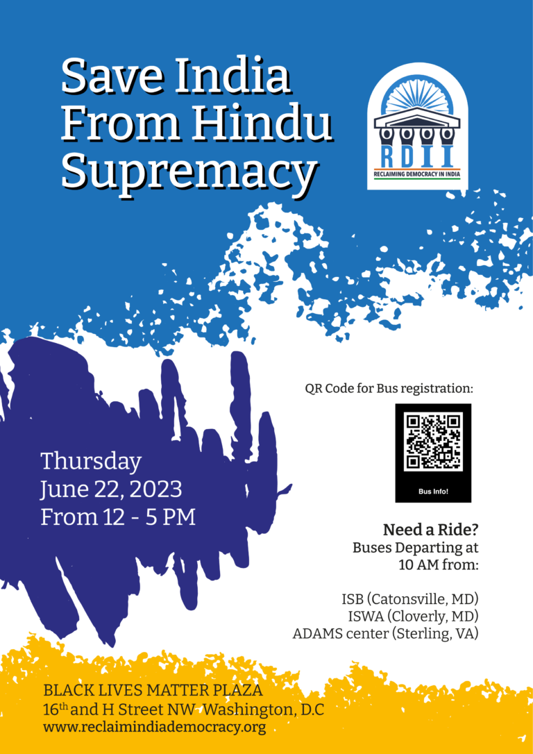 Participate to our Events 22 Sep, 2024 Raise Your Voice Against A Decade of Oppression Nassau Veterans Memorial Coliseum Register for Bus 22 Jun, 2023 Protest to Save India from Hindu Supremacy Black Lives Matter Plaza, Washington D.C Register for Bus 21 Jun, 2023 Media Advisory & Protest Against Biden Administration’s Platforming of PM Modi Washington D.C More Information 21 Jun, 2023 Press Conference : Victims, Experts to Highlight Prime Minister Modi’s Authoritarianism and Human Rights Violations National Press Club, Washington D.C More Information 21 Jun, 2023 Howdy Democracy?! An evening of music, conversation & concern NYC Buy tickets Want to make a difference? Help us raise money for our humanitarian causes Donate